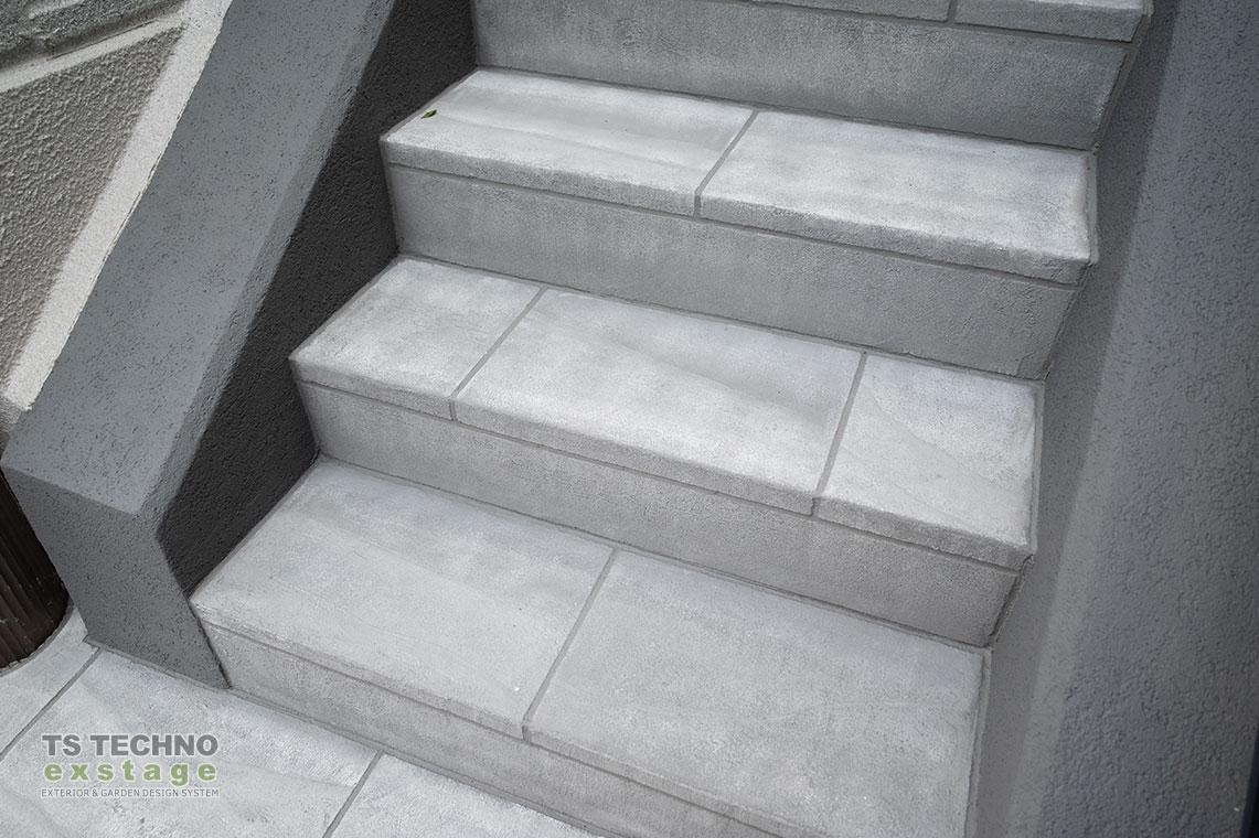 階段の幅も狭く外階段を通らないと出入りができないため、通常のタイル張替えでは通行できない期間が発生し施主様の生活に支障がある…ということで、今回はローラーストーンでのリフォームをご提案しました。